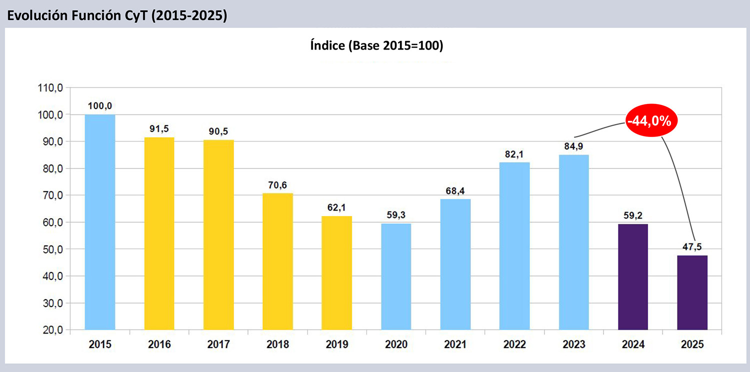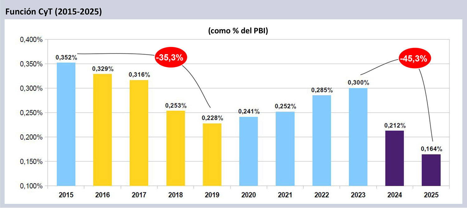 De acuerdo con el trabajo, los recursos de la Función CyT se deterioraron un 19,7% en 2025, considerando el crédito vigente (CV) y la pauta de ejecución durante los diez primeros meses del año, lo que se añade a una caída del 30,2% en 2024. De esta manera, en los últimos dos años se acumula un retroceso del 44% real y el desplome se agudiza hasta un 52,5% en relación con el año 2015.