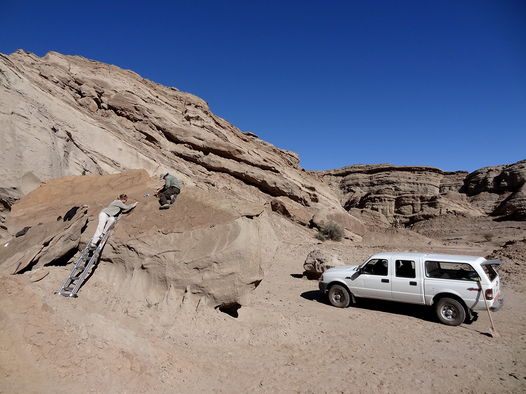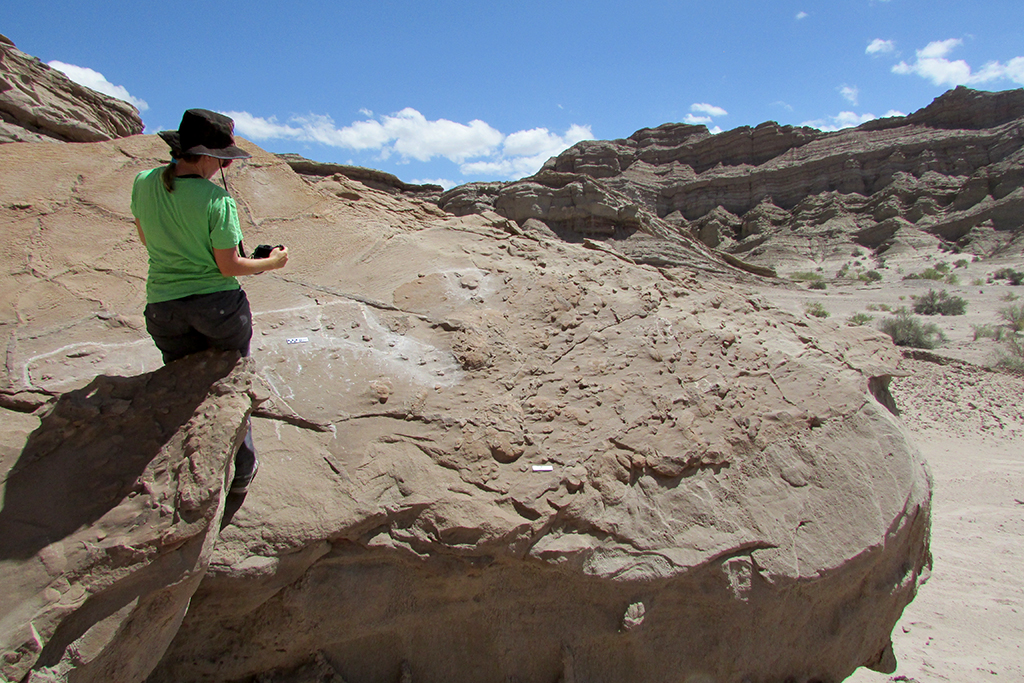 El trabajo se realizó en dos yacimientos del Mioceno tardío, Toro Negro, en La Rioja, y Huayquerías, en Mendoza. Vera, que es becaria doctoral en el Instituto de Estudios Andinos Don Pablo Groeber (IDEAN, UBA-CONICET) en la Facultad de Ciencias Exactas y Naturales de la UBA, explica cómo encaró su hallazgo: “Empecé a ver que había algún tipo de patrón, porque en los dos sitios las huellas aparecen en acumulaciones. En uno hay casi trescientas y en el otro, alrededor de doscientas. Están todas juntas y a simple vista parecen caóticas. Buscando un método para analizar las superficies encuentro que se puede medir la relación con el norte y entender la dirección del movimiento”.
