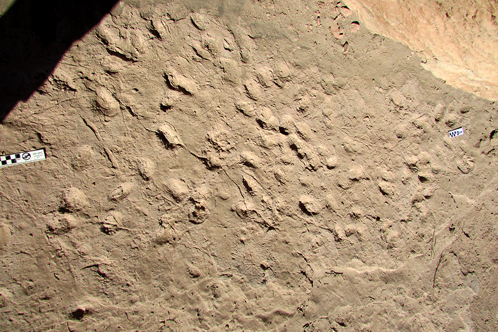 La autora comenta que, en Toro Negro, no sólo aparecían todas juntas, sino que también estaban atravesadas por otros animales. “Se aprecian huellas de un perezoso gigante por encima y de aves por abajo, entre otras pisadas. Eso indica que son secuencias de movimientos de diferentes tiempos, algo que, junto al trazado de la dirección, nos permite sostener que estas huellas de ungulados pertenecen a un mismo evento. Así, el trabajo propone que no solo la evidencia de rastrilladas paralelas es la que funciona para verificar el comportamiento social”, afirma.