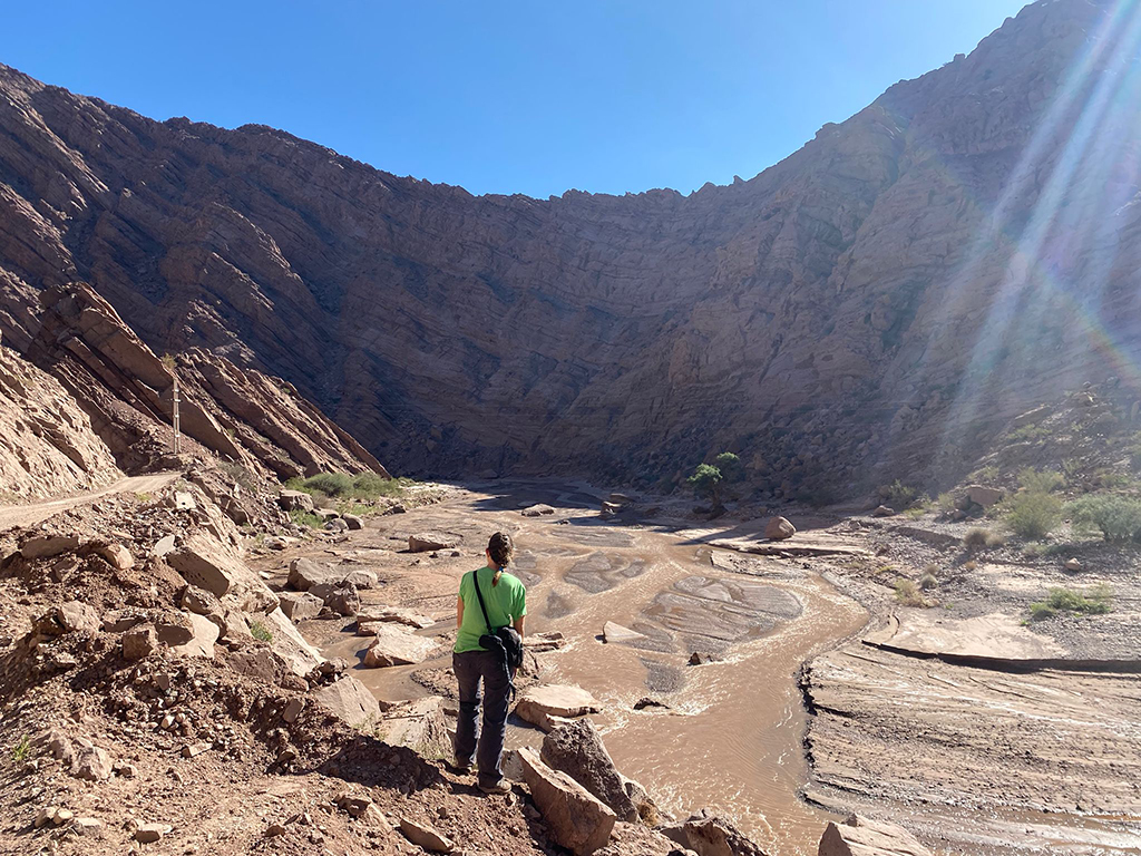 Caminaban bordeando un río seco, a través de un terreno privado que encierra vastas porciones de plena naturaleza en Mendoza. Se dirigían hacia un sitio estudiado desde hace años. La zona es un tesoro paleontológico, reservorio de testimonios fósiles que iluminan los rastros de una vida lejana. De repente, las vio. Intactas, al costado del camino, un montón de huellas de proterotéridos, un grupo de ungulados con extremidades similares a las de los caballos actuales, completamente extinto, que habitó América del Sur hasta hace dos millones de años.
