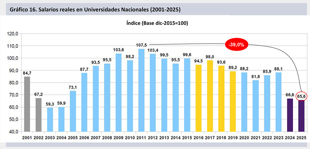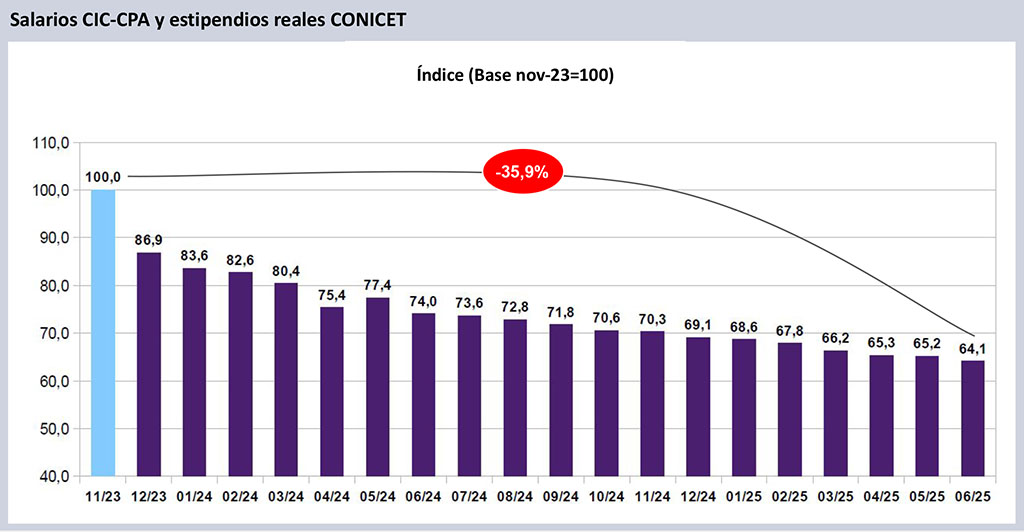 Este nuevo descenso lleva a que, entre noviembre de 2023 (último mes liquidado por la gestión anterior) y junio de 2025, los salarios CONICET (CIC-CPA y Becas) se derrumbaron un 35,9% real, mientras que para docentes investigadores de las universidades nacionales la caída es del 29,2% y para el resto del empleo público (SINEP) alcanza al 26,9%.
