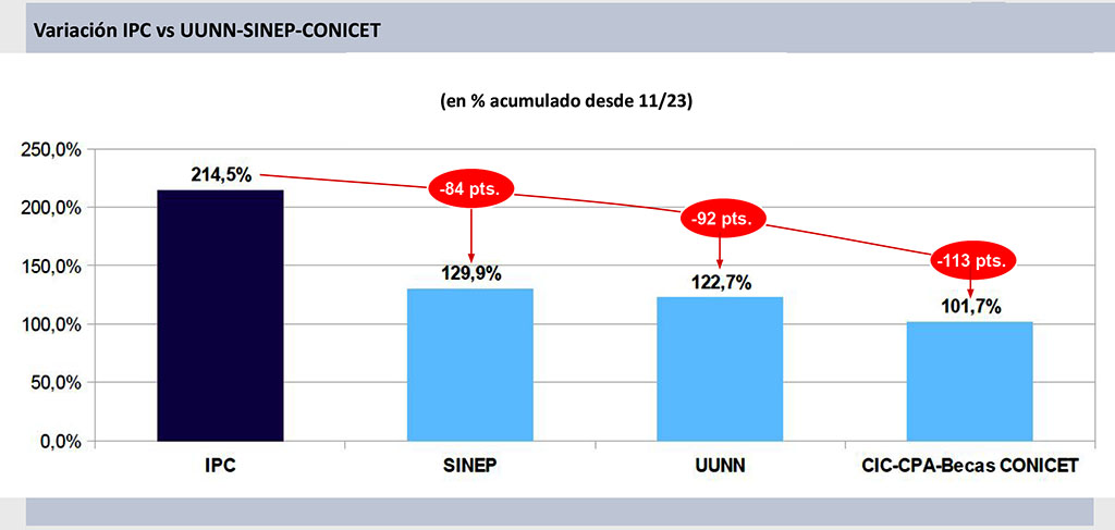 El origen de esta situación de degradación de los ingresos surge del hecho de que desde la asunción del nuevo gobierno, la variación del índice de precios al consumidor alcanzó un 214,5% pero, en el mismo período, las remuneraciones de los trabajadores del SINEP se incrementaron nominalmente un 129,9%, los salarios de docentes e investigadores en universidades lo hicieron un 122,7% y los distintos agrupamientos del CONICET (CIC-CPA y becas) aumentaron un 101,7%. De esta manera los diversos agrupamientos pierden entre 84 y 113 puntos respecto de noviembre del 2023.