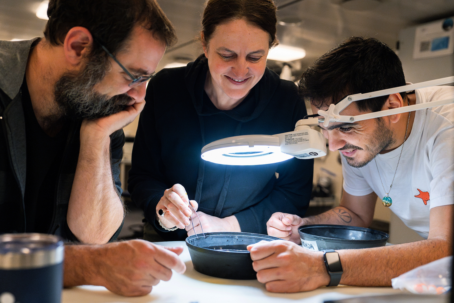 De izquierda a derecha, Fabrizio Scarabino (Universidad de la República, Uruguay), Juliana Giménez (IBBEA, CONICET, Exactas UBA) y Leonel Pacheco (Museo Argentino de Ciencias Naturales) analizando muestras biológicas en el laboratorio principal del R/V Falkor (too). Foto: Misha Vallejo Prut/SOI.