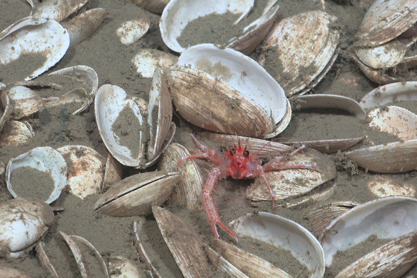 Los científicos observaron esta pequeña langosta en un lecho de valvas de almejas quimiosintéticas de los géneros Archivesica sp. y Calyptogena sp., a 619 metros, mientras exploraban hábitats quimiosintéticos asociados a un montículo de carbonato derivado del metano. En aguas argentinas, la biodiversidad y el contexto ambiental de estos ecosistemas quimiosintéticos siguen siendo poco conocidos. Foto: ROV SuBastian/SOI.