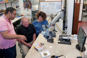 Muchos años antes de que los pájaros se cruzaran en su camino académico, Mindlin estudió Física en la Universidad Nacional de La Plata, y aún antes de terminar su licenciatura ya se interesaba por los sistemas dinámicos, atraído en los 80 por las enseñanzas del cosmólogo platense Héctor Vucetich, y “fascinado con la idea de que sistemas deterministas pudieran tener evoluciones muy complejas, lo que me parecía algo radical, transformador”. A partir de su doctorado en la Drexel University, en Filadelfia, se abocó a la dinámica no lineal “pura y dura”, y siguió explorando temas tradicionales de la física: teoría de nudos, mecánica de fluidos. De regreso al país, Guillermo “Billy” Dussel, entonces director del Departamento de Física, lo impulsó a montar un laboratorio experimental. Y Mindlin aceptó: iba a ser un laboratorio dedicado a… láseres semiconductores.